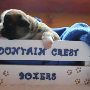 Puppies are now two week’s old! by Mountain Crest Boxers · Published October 21, 2014 · Updated October 29, 2014 Puppies are now two week’s old! Pink is “staying with Mountain Crest” Blue is staying with Bridges Boxers. All others are still available.
